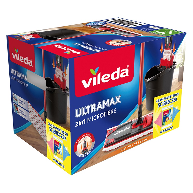 Mop płaski UltraMax z wiadrem z wyciskaczem UltraMax to zestaw do mycia podłóg, który umożliwia wyciskanie i wyżymanie mopa bez brudzenia i moczenia rąk.
